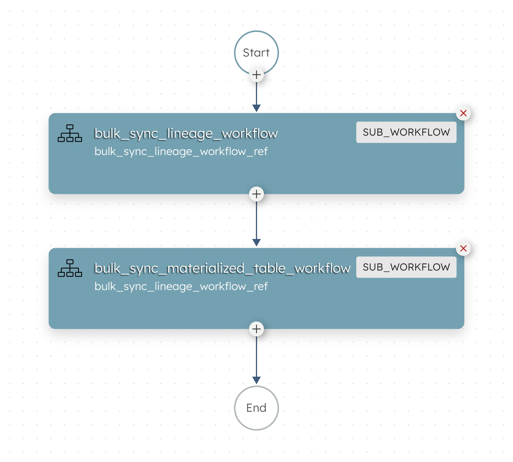 The above visual is that of the Summation parent workflow that processes downstream tables based on lineage and materializes each one by invoking a subworkflow detailed below. Orkes provides operational guardrails for the task execution layer. Summation uses it to enforce global limits on concurrent workers and to control access to shared data using