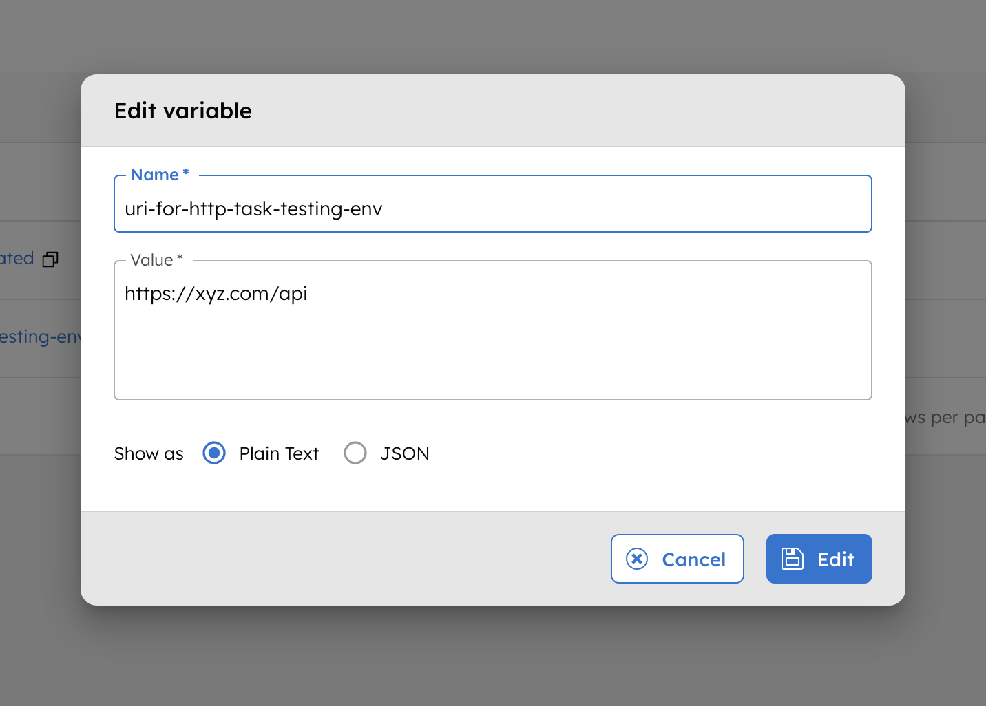 - Value Type–Select Plain Text or JSON.